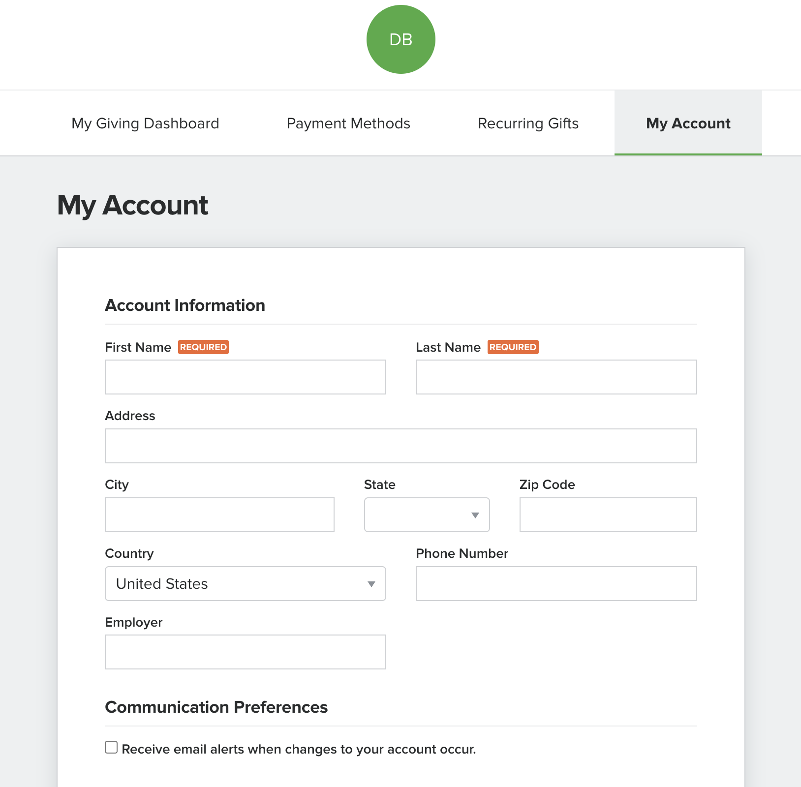 This is now what you will see in your Member Portal. All donations will be listed and if payment information was saved you will be able to update your card or change payment methods under Payment Methods, you can also manage your Recurring Gifts.